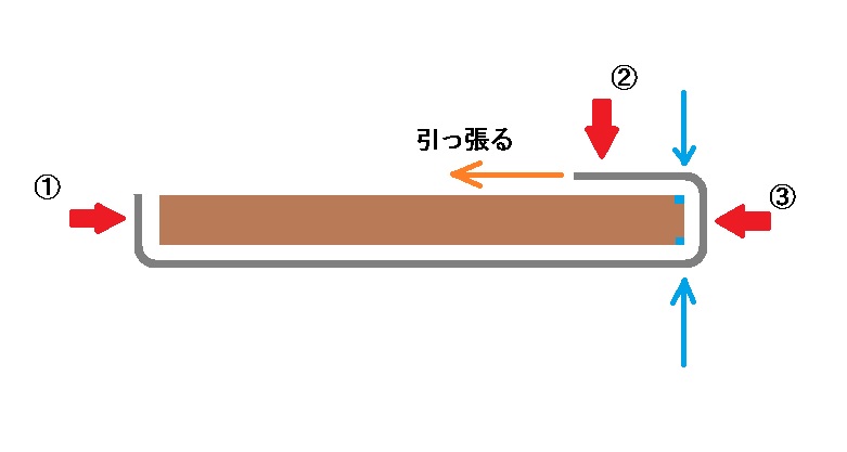 まず@の部分を端から全部打ち込み固定したら、クロスをぐるっと巻き込んでオレンジの方向に引っ張ります。青で示した部分の2か所の角が摩擦抵抗で緩みにくく引っ張りやすくなりますので、ここでAの中央を打ちます。その後Aの周辺を引っ張りながらどんどん打っていきます。Aが全て打てたらBを打ちます。
