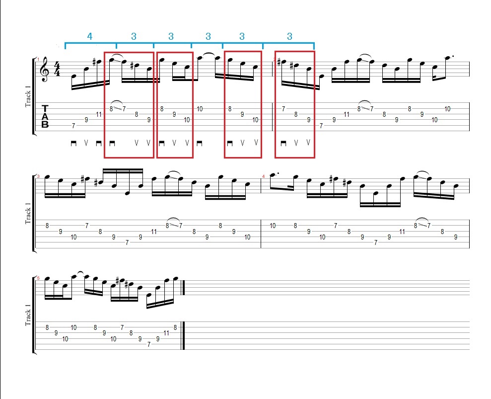 最初はピッキングを意識せずに弾いていたんですが、ゆっくり確認してみたら私も同じパターンでピッキングしていました。ポール・ギルバートのアウトサイドで自分的にしっくりこない部分があるのはわかっていたんですが、あとで藤岡先生がきれいに弾いているのを見て、この方法もアリなのかなと思いました。ただし、正確なピッキングが必要にはなりますが。