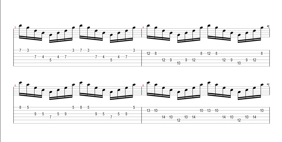 スキッピングを駆使すると、覚えやすく応用が簡単にでき、すごく難しく聞こえます。ピッキング自体は速さより正確なアウトサイドピッキングの会得です。フィンガリングにストレッチが多く出てきますが、薬指の強化をしていれば大したことはないです。これらは速弾きのピッキングではないんですが、十分インパクトがあり、フレーズの速さも出せるので、必ず会得しましょう。
