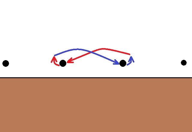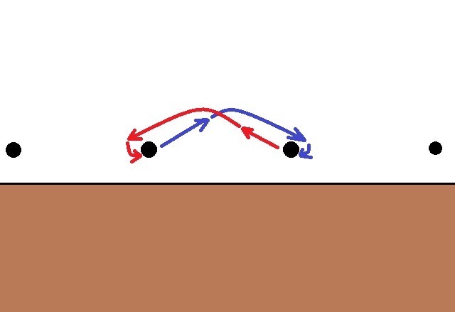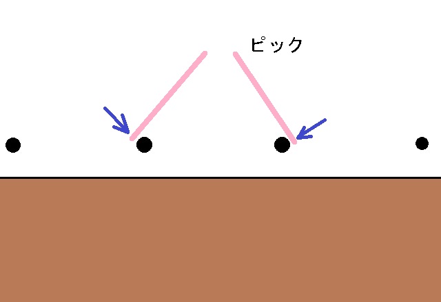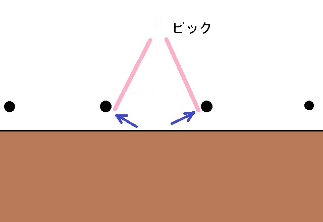 アウトサイドでは2本の弦の外側からピッキングするので、振り幅が大きくなります。メリットは、ピックを浅く入れても深く入れても比較的ミスピッキングが少なくて済みます。振り幅が大きくなるということはスピード的にはマイナスですが、確実に弾けるという強みが余裕を生みます。